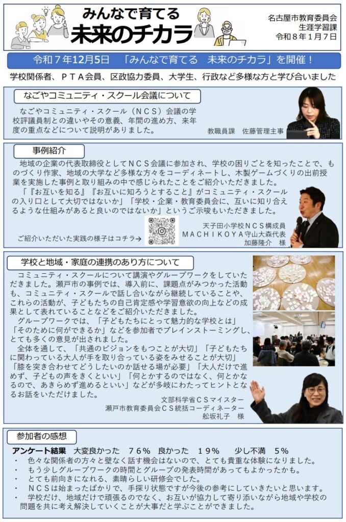 先日、令和7年12月5日に名古屋市教育委員会生涯学習課様主催で開催された「みんなで育てる未来のチカラ」において、MACHIKOYAの取組の事例紹介をさせていただきました。