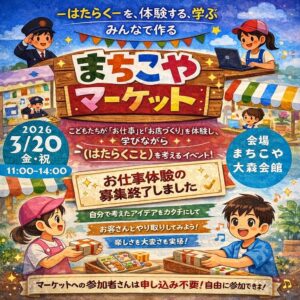 -はたらく-を、体験する、学ぶみんなで作るまちこやマーケット こどもたちが「お仕事」と「お店づくり」を体験し、学びながら(はたらくこと)を考えるイベントを開催します。 3/20(祝)11時〜14時に職業体験まちこやマーケ […]